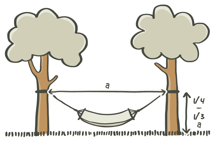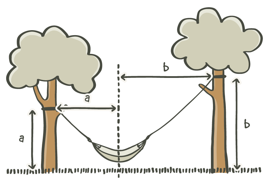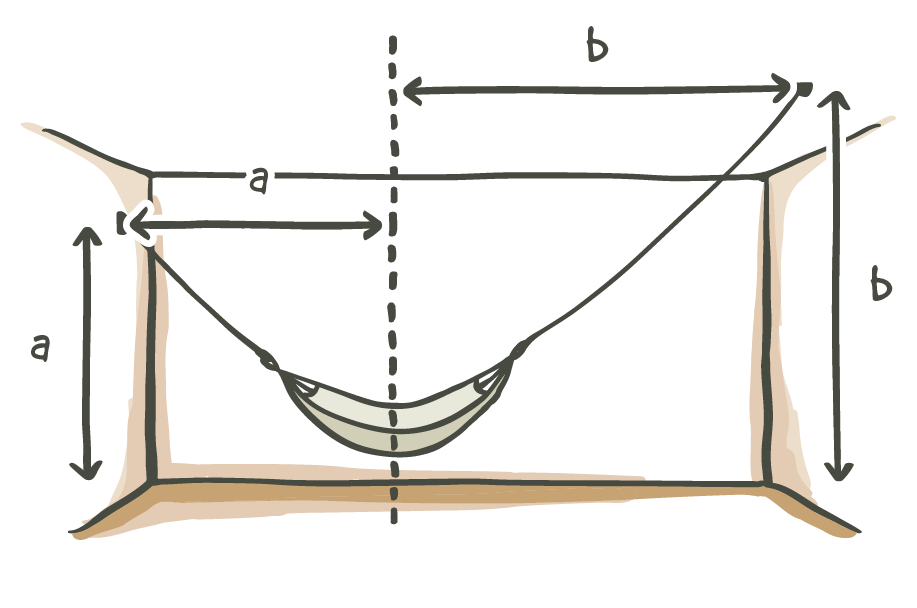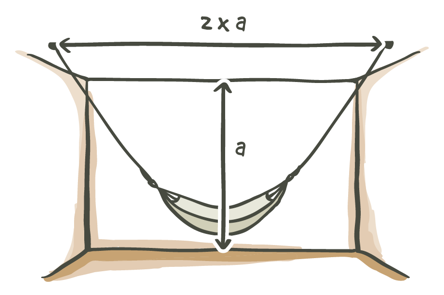 For example, if your hammock is centered and there are four meters (13‘1“) distance (length) between the suspension points, the suspension points should be at a minimum height of two meters (6‘7“).