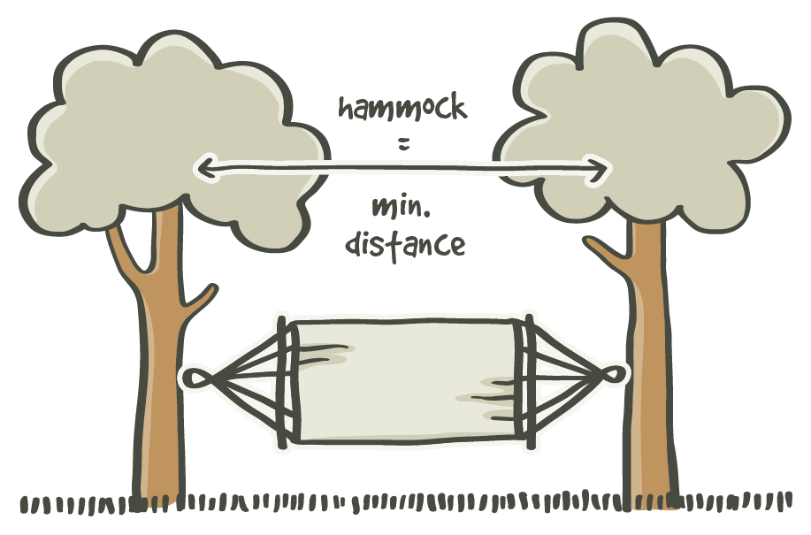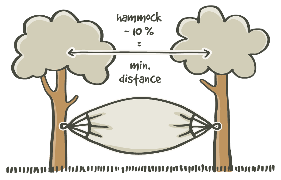 For example: If your hammock is three meters (9‘10“) long, the minimum required distance is 270 cm (8‘10“).