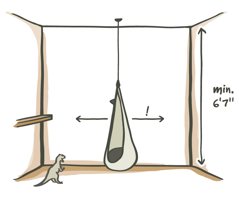 You should always place a Joki hanging nest so that it cannot bump into walls, furniture or other objects when swinging. In addition, the ceiling/hanging point must have a height of 6‘6“ - 13‘ (2-4 m), or 7‘2“ - 13‘9“ (2.20-4.20 m) for Joki Air hanging nest.